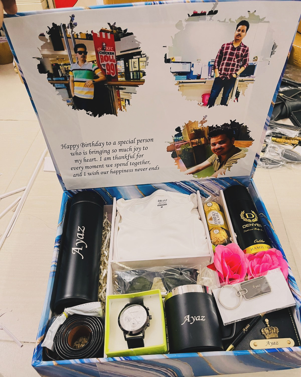 The inside lid features a custom photo collage with a birthday message, making the hamper extra special and meaningful.
