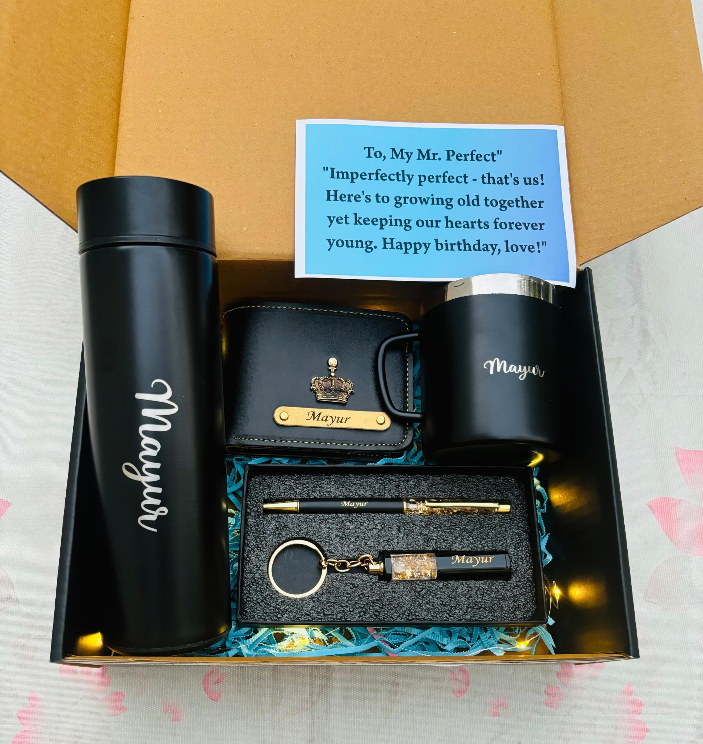 A perfect compact personalized gift hamper designed to make gifting simple yet special. This elegant hamper includes premium accessories that can be customized with a name, making it a thoughtful gift for any occasion.
