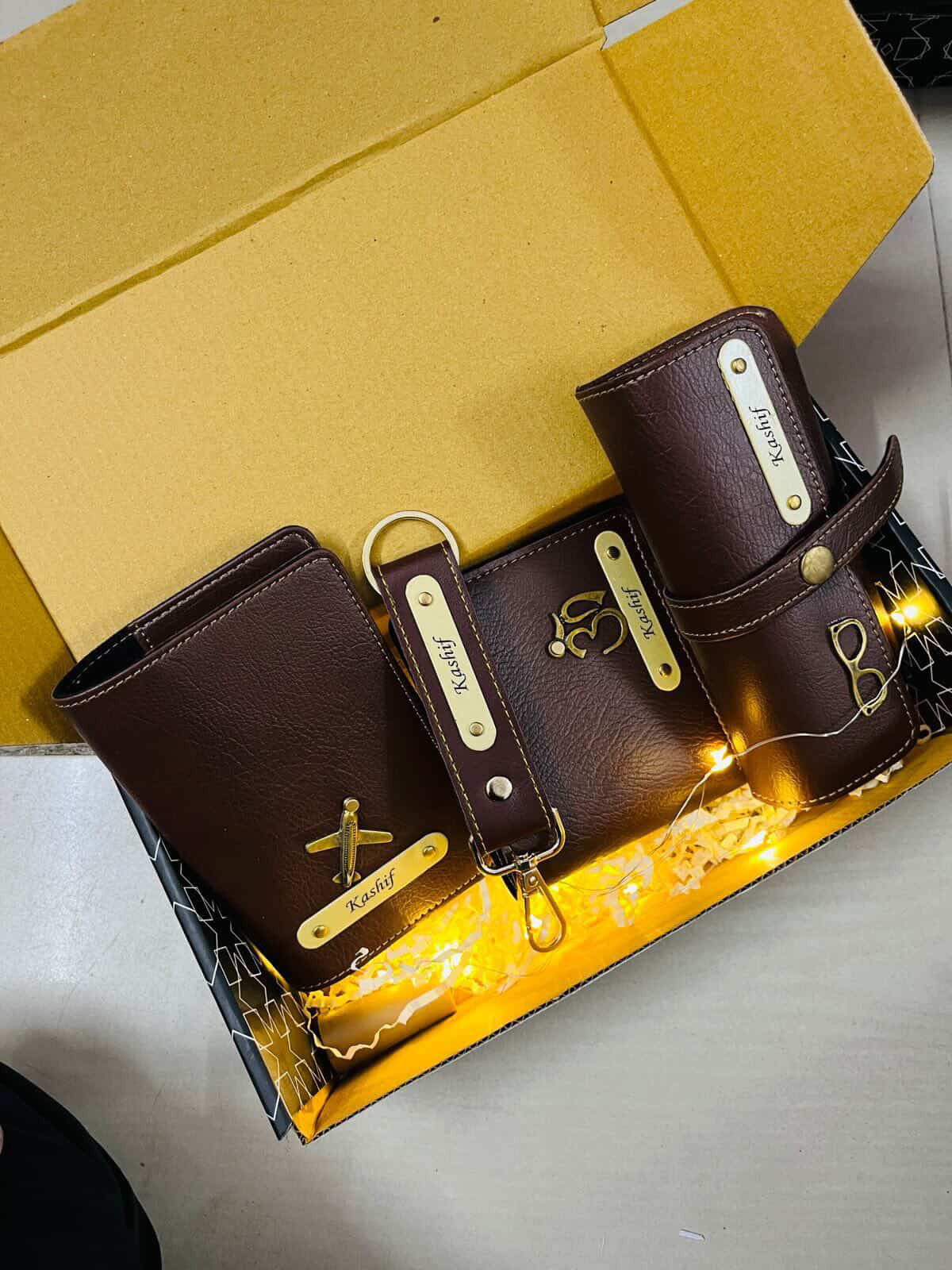A stylish all-in-one personalized gift combo designed for daily use and special occasions. This premium set includes a wallet, card holder, keychain, pen pouch, and a gold flake pen – all customized with a name to create a unique and memorable gift.