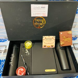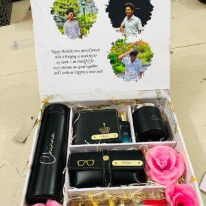 A perfect compact personalized gift hamper designed to make gifting simple yet special. This elegant hamper includes premium accessories that can be customized with a name, making it a thoughtful gift for any occasion.
